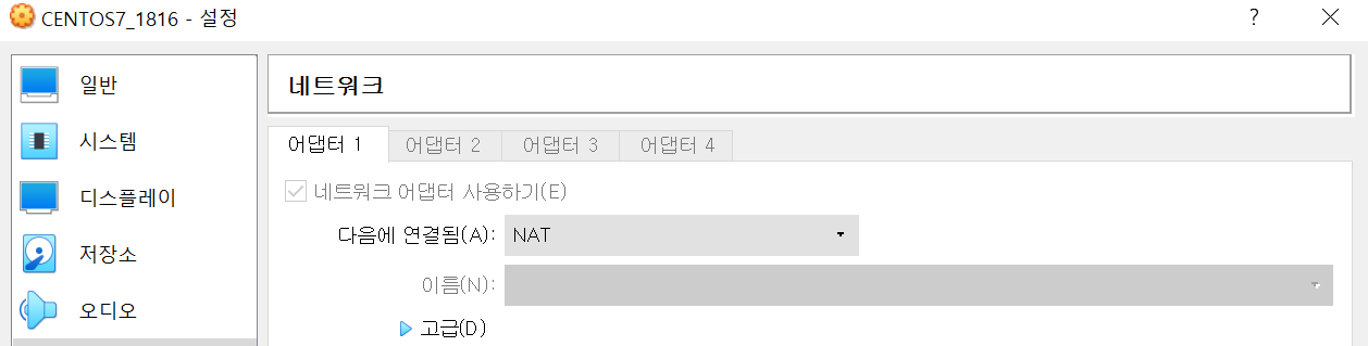 1. 다음과 같이 virtualbox의 VM에서 네트워크 설정을 NAT으로 설정합니다.