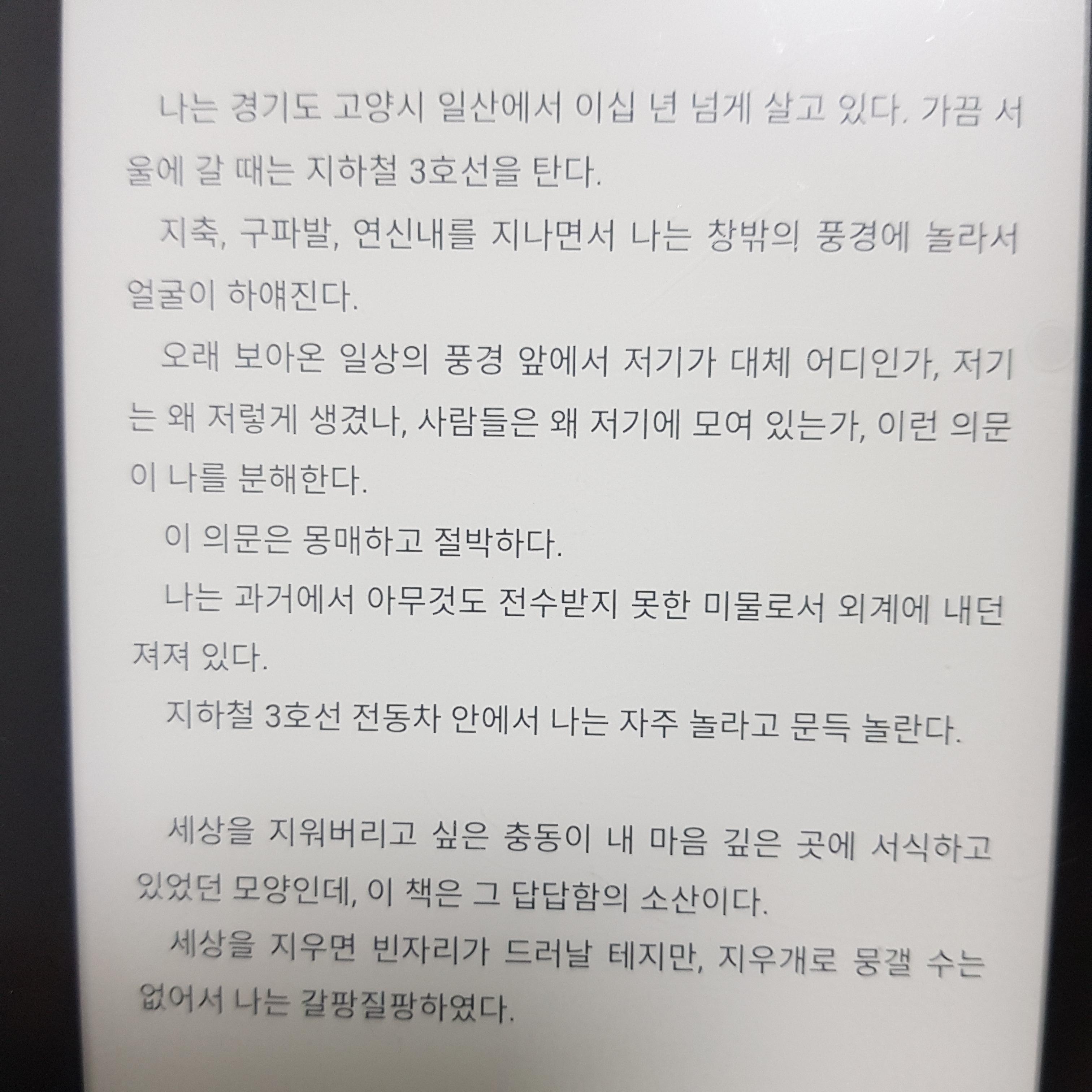 주로 작가는 담담하게 객관적인 시선으로 내용들을 풀어나가고 있는데, 그래서 문장 하나 하나 마다 읆조리며 음미하다 보면 한 폭의 풍경화를 그저 바라보고 있는 듯한 착각도 들었습니다.