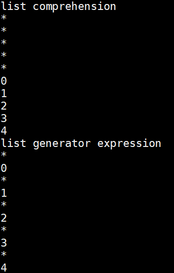 list comprehension의 경우 iterator를 생성하기 위해 data를 모두 memory에 올리기 때문에 '*'이 모두 출력되고 이후 for 문에 의해 data를 출력하게 됩니다.