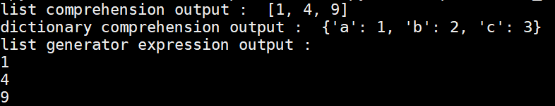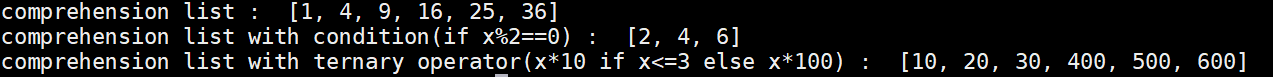 print("comprehension list with ternary operator(x*10 if x<=3 else x*100) : ",c_list)
