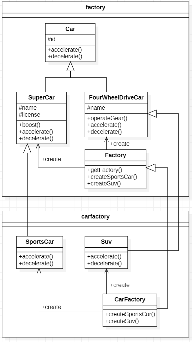 FourWheelDriveCar cayenne = factory.createFourWheelDriveCar(200, "Cayenne");