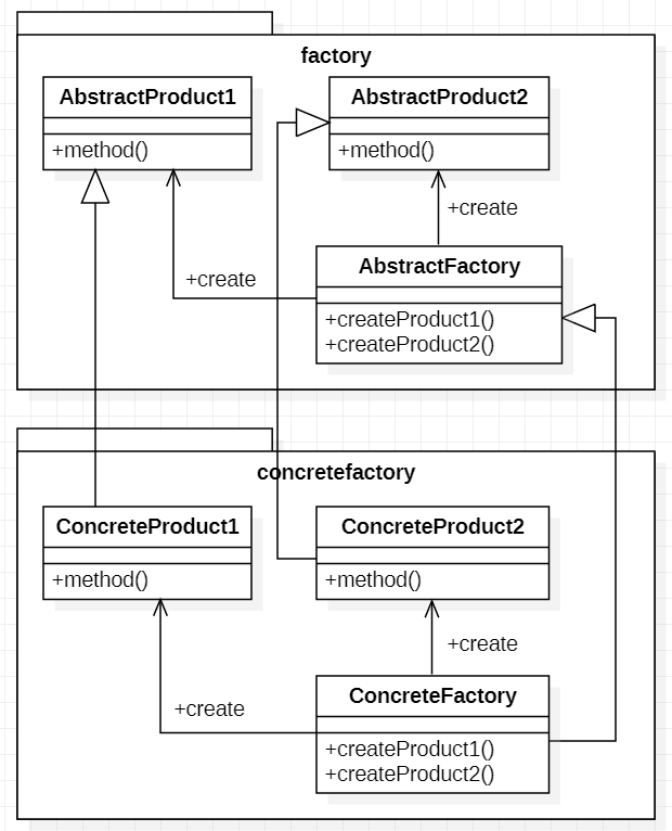 factory package의 AbstractFactory는 AbstractProduct1, AbstractProduct2를 만듭니다.