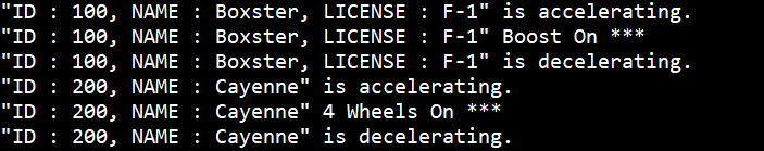슈퍼카에는 좀 더 가속 가능한 부스터(boost())기능이 있고, 4륜구동차량에는 4개휠을 사용할 수 있는 기어작동모드(operateGear())가 있습니다.