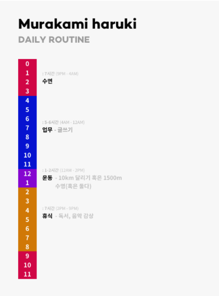 ※ 언젠가 삶이 자유로워지면 무라카미 하루키처럼 하고 싶은 일에 집중하며, 루틴한 삶을 나도 살고 싶다.