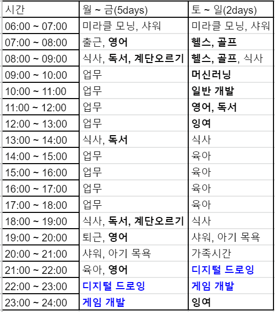 6. 글쓰기 : 틈틈이(각 항목에서 쪼개 씀) : 평일 + 휴일(9분 x 7일) = 1시간