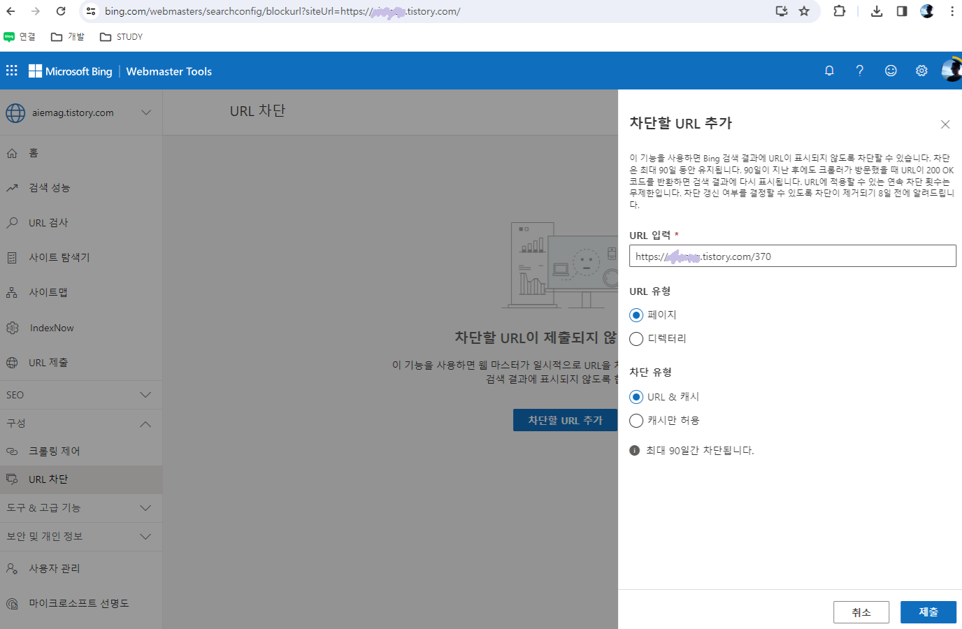 - 빙 웹마스터도구 접속(https://www.bing.com/webmasters)의 URL 차단 메뉴에서 검색 제외