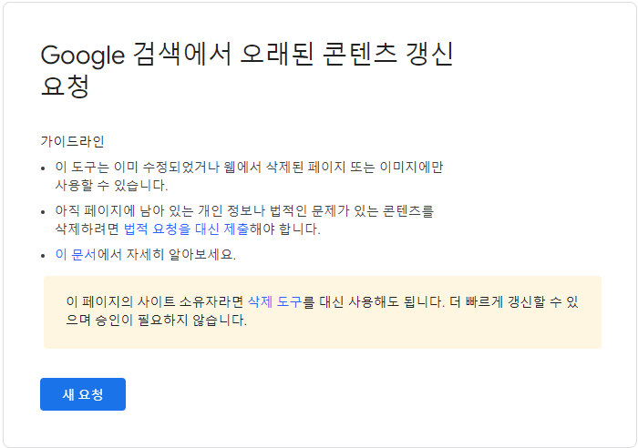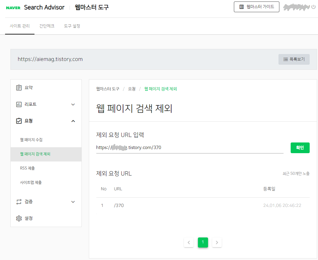 - 새요청을 click하여 검색 제외하려는 포스팅 URL을 입력하여 제외 등록.