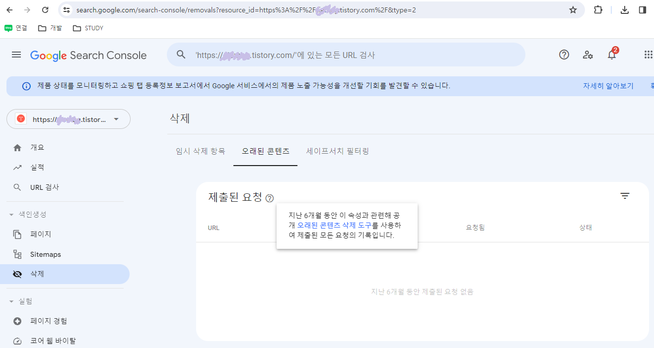 - 구글 서치 콘솔(티스토리 블로그 설정메뉴 -> 플러그인 -> 연결된 구글 서치 콘솔로 접속)에 접속하여 '오래된 콘텐츠 탭' click -> 제출된 요청(?) click -> '오래된 콘텐츠 삭제 도구' link를 click